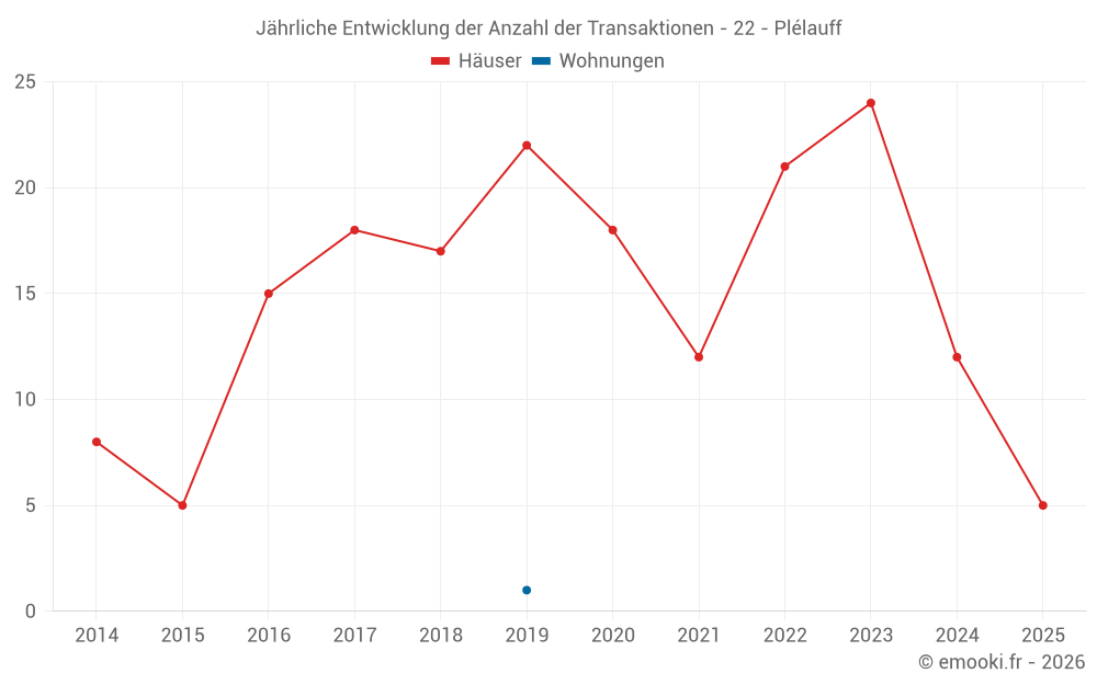 Der Durchschnittspreis auf den 27 Hausgeschäften der letzten 24 Monate in der Gemeinde Plélauff betrug 1 068 € pro Quadratmeter für einen mittleren Immobilienwert von 79 800 €. Über diesen Zeitraum hinweg lagen 60% der Transaktionen zwischen 595 und 1 775 € pro Quadratmeter (vom 2. bis zum 8. Dezil).