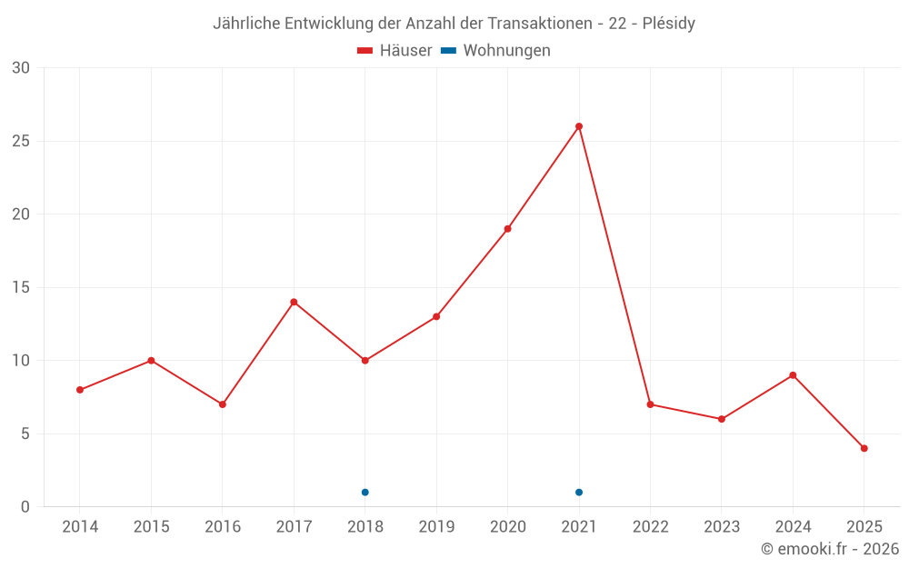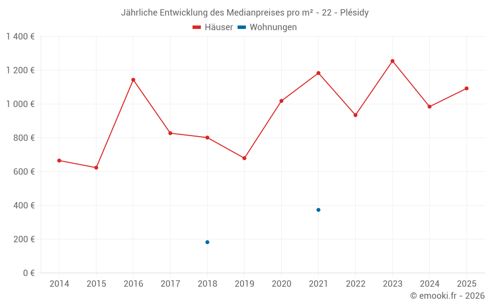 Der Durchschnittspreis auf den 14 Hausgeschäften der letzten 24 Monate in der Gemeinde Plésidy betrug 1 149 € pro Quadratmeter für einen mittleren Immobilienwert von 117 500 €. Über diesen Zeitraum hinweg lagen 60% der Transaktionen zwischen 850 und 1 454 € pro Quadratmeter (vom 2. bis zum 8. Dezil).