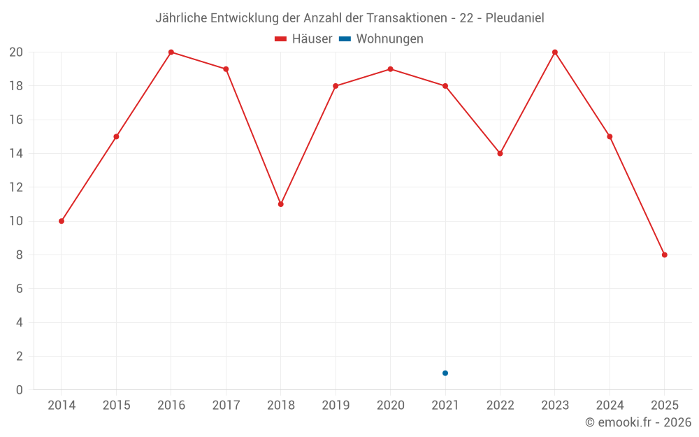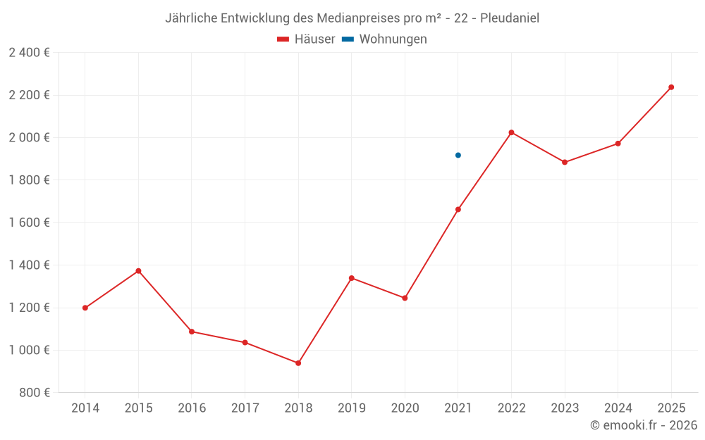 Der Durchschnittspreis auf den 16 Hausgeschäften der letzten 12 Monate in der Gemeinde Pleudaniel betrug 2 237 € pro Quadratmeter für einen mittleren Immobilienwert von 167 775 €. Über diesen Zeitraum hinweg lagen 60% der Transaktionen zwischen 1 250 und 2 955 € pro Quadratmeter (vom 2. bis zum 8. Dezil).