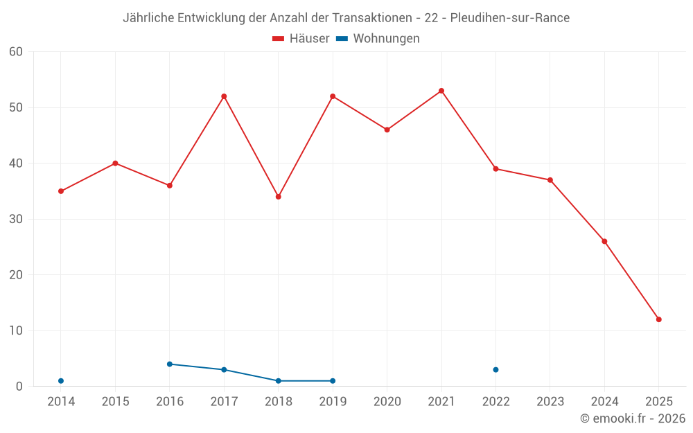 Der Durchschnittspreis auf den 25 Hausgeschäften der letzten 12 Monate in der Gemeinde Pleudihen-sur-Rance betrug 2 638 € pro Quadratmeter für einen mittleren Immobilienwert von 280 000 €. Über diesen Zeitraum hinweg lagen 60% der Transaktionen zwischen 1 524 und 3 549 € pro Quadratmeter (vom 2. bis zum 8. Dezil).