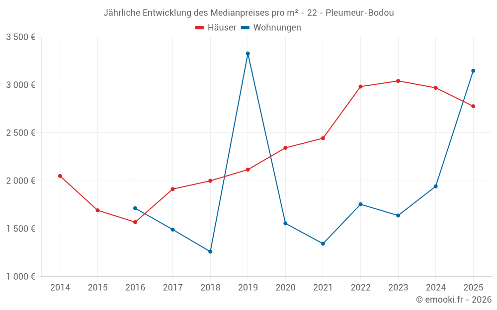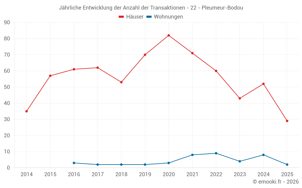 Der Durchschnittspreis auf den 29 Hausgeschäften der letzten 6 Monate in der Gemeinde Pleumeur-Bodou betrug 2 778 € pro Quadratmeter für einen mittleren Immobilienwert von 250 000 €. Über diesen Zeitraum hinweg lagen 60% der Transaktionen zwischen 1 566 und 4 199 € pro Quadratmeter (vom 2. bis zum 8. Dezil).