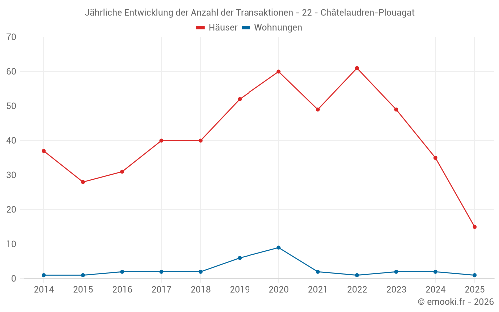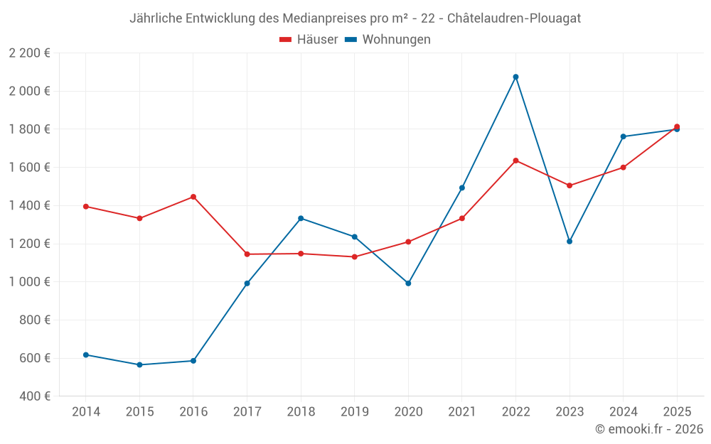 Der Durchschnittspreis auf den 31 Hausgeschäften der letzten 12 Monate in der Gemeinde Châtelaudren-Plouagat betrug 1 600 € pro Quadratmeter für einen mittleren Immobilienwert von 170 000 €. Über diesen Zeitraum hinweg lagen 60% der Transaktionen zwischen 957 und 2 131 € pro Quadratmeter (vom 2. bis zum 8. Dezil).