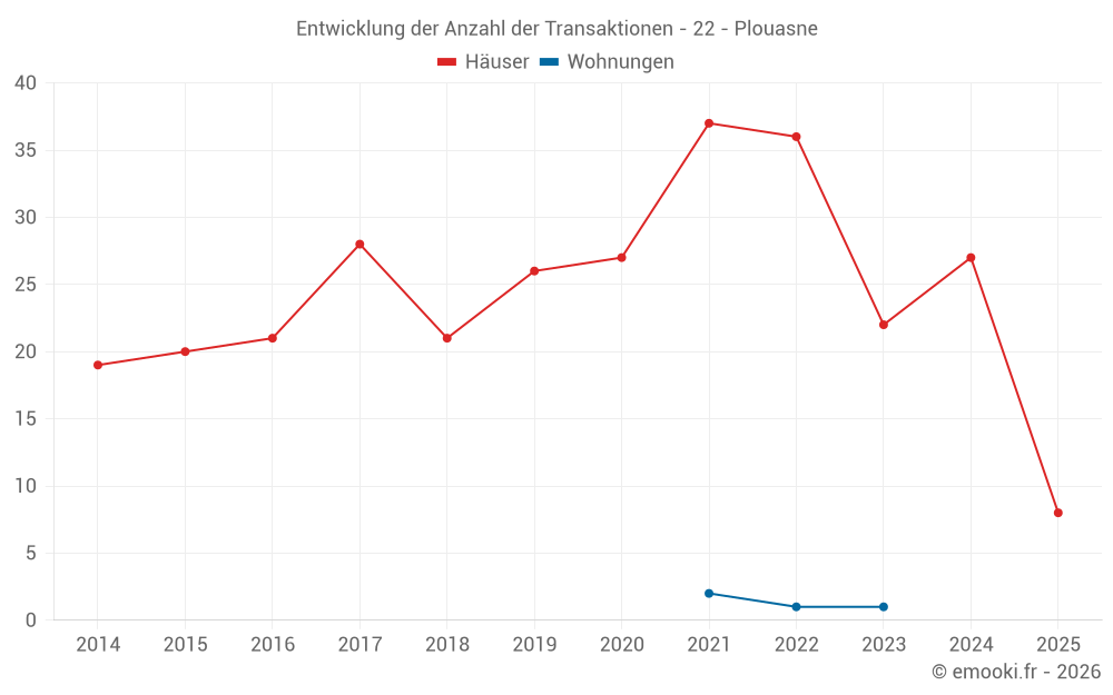 Der Durchschnittspreis auf den 20 Hausgeschäften der letzten 12 Monate in der Gemeinde Plouasne betrug 1 270 € pro Quadratmeter für einen mittleren Immobilienwert von 104 250 €. Über diesen Zeitraum hinweg lagen 60% der Transaktionen zwischen 803 und 1 541 € pro Quadratmeter (vom 2. bis zum 8. Dezil).