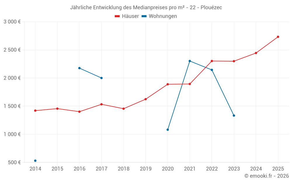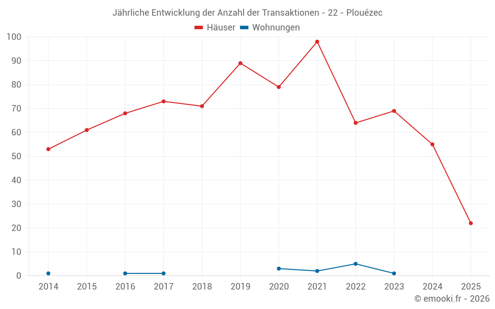 Der Durchschnittspreis auf den 22 Hausgeschäften der letzten 6 Monate in der Gemeinde Plouézec betrug 2 732 € pro Quadratmeter für einen mittleren Immobilienwert von 212 500 €. Über diesen Zeitraum hinweg lagen 60% der Transaktionen zwischen 2 245 und 3 395 € pro Quadratmeter (vom 2. bis zum 8. Dezil).