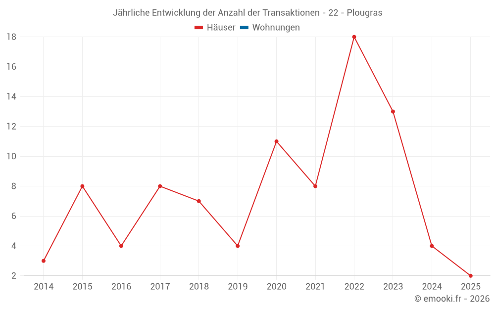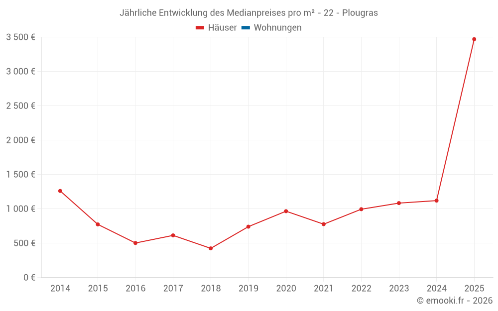 Der Durchschnittspreis auf den 15 Hausgeschäften der letzten 24 Monate in der Gemeinde Plougras betrug 1 250 € pro Quadratmeter für einen mittleren Immobilienwert von 116 000 €. Über diesen Zeitraum hinweg lagen 60% der Transaktionen zwischen 755 und 2 418 € pro Quadratmeter (vom 2. bis zum 8. Dezil).