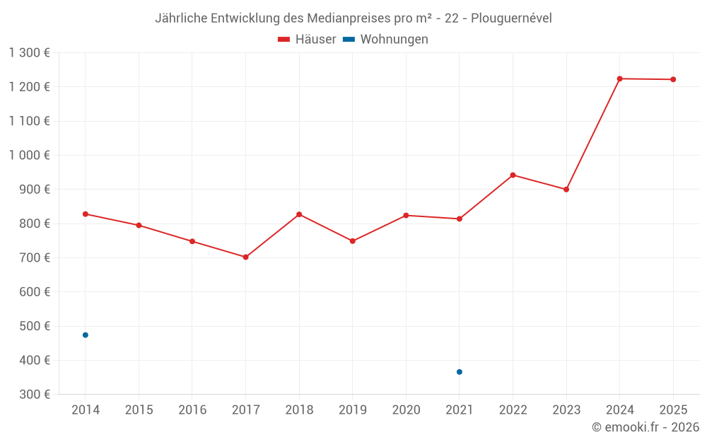 Der Durchschnittspreis auf den 23 Hausgeschäften der letzten 12 Monate in der Gemeinde Plouguernével betrug 1 222 € pro Quadratmeter für einen mittleren Immobilienwert von 118 000 €. Über diesen Zeitraum hinweg lagen 60% der Transaktionen zwischen 890 und 1 660 € pro Quadratmeter (vom 2. bis zum 8. Dezil).