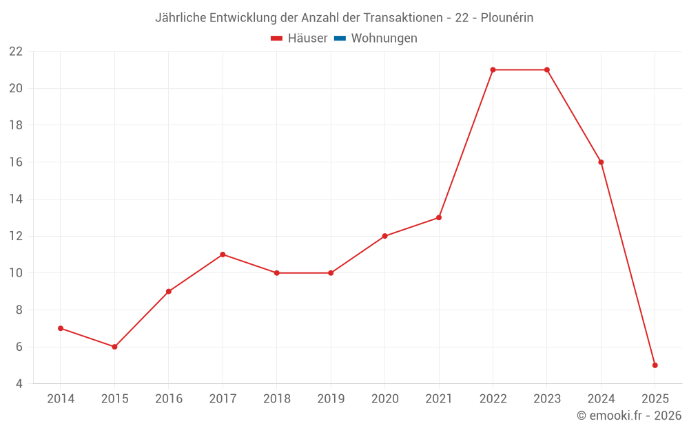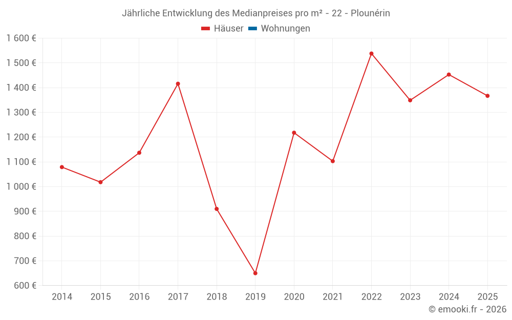 Der Durchschnittspreis auf den 36 Hausgeschäften der letzten 24 Monate in der Gemeinde Plounérin betrug 1 404 € pro Quadratmeter für einen mittleren Immobilienwert von 103 000 €. Über diesen Zeitraum hinweg lagen 60% der Transaktionen zwischen 860 und 1 923 € pro Quadratmeter (vom 2. bis zum 8. Dezil).