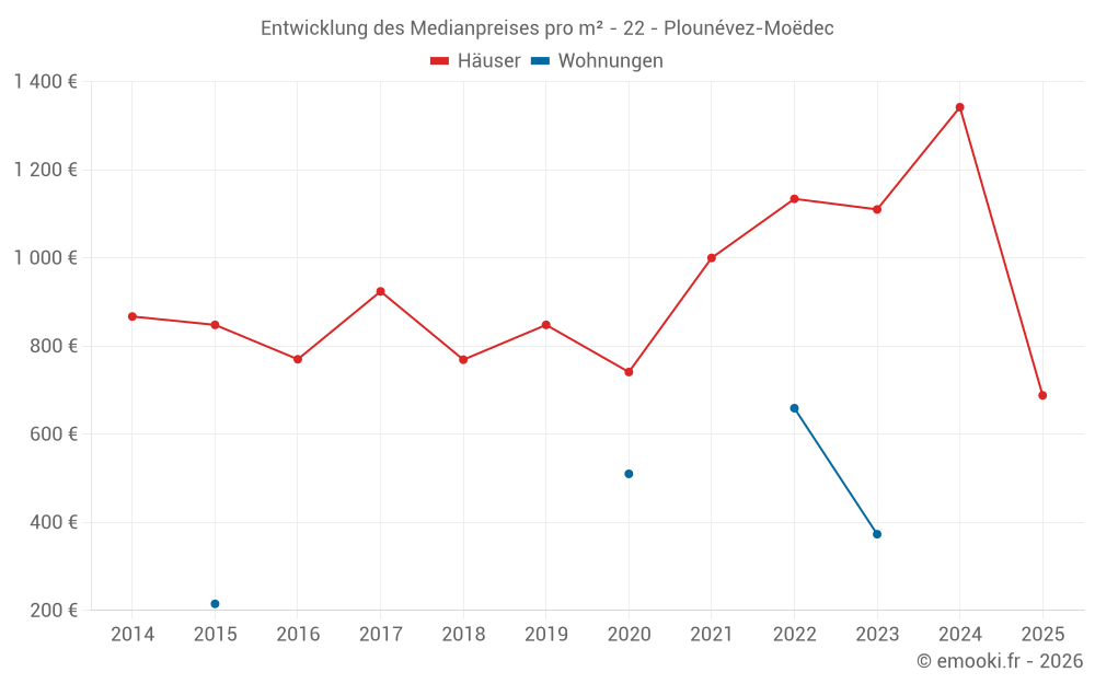 Der Durchschnittspreis auf den 30 Hausgeschäften der letzten 12 Monate in der Gemeinde Plounévez-Moëdec betrug 1 366 € pro Quadratmeter für einen mittleren Immobilienwert von 94 000 €. Über diesen Zeitraum hinweg lagen 60% der Transaktionen zwischen 582 und 2 129 € pro Quadratmeter (vom 2. bis zum 8. Dezil).