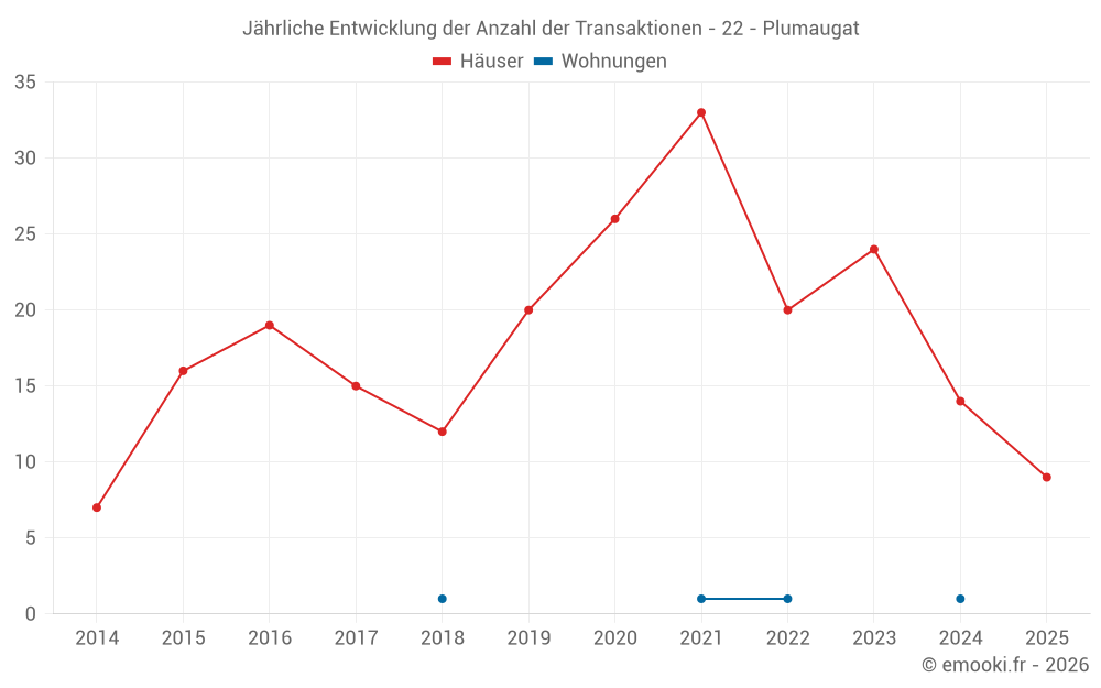 Der Durchschnittspreis auf den 17 Hausgeschäften der letzten 12 Monate in der Gemeinde Plumaugat betrug 1 072 € pro Quadratmeter für einen mittleren Immobilienwert von 90 000 €. Über diesen Zeitraum hinweg lagen 60% der Transaktionen zwischen 724 und 1 307 € pro Quadratmeter (vom 2. bis zum 8. Dezil).