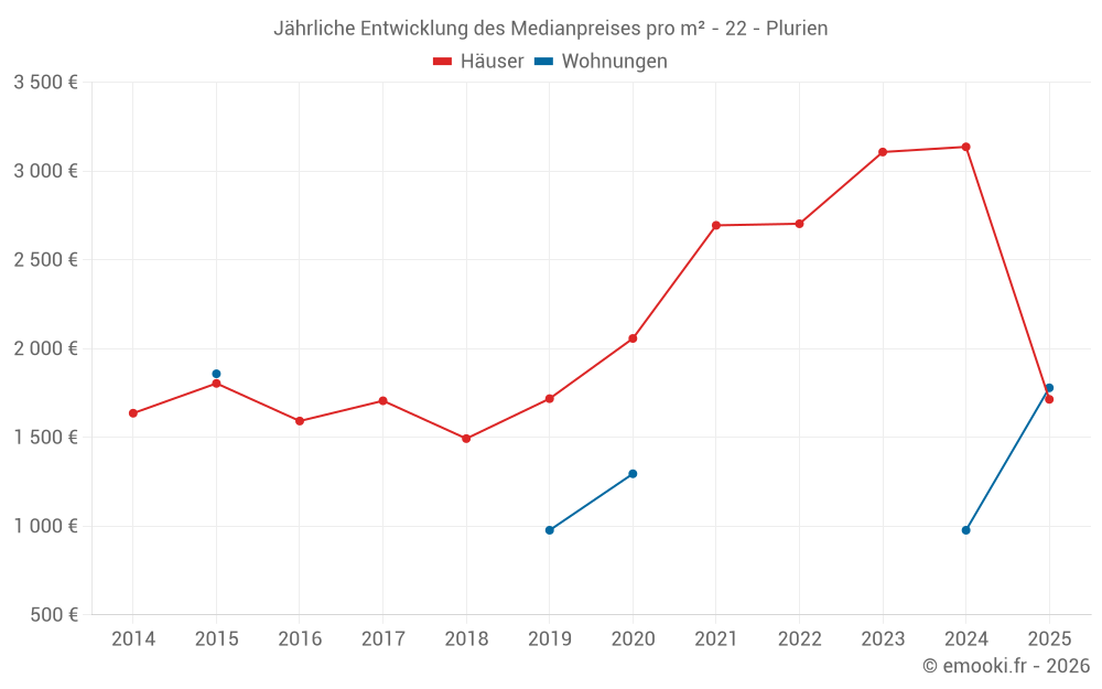Der Durchschnittspreis auf den 25 Hausgeschäften der letzten 12 Monate in der Gemeinde Plurien betrug 2 871 € pro Quadratmeter für einen mittleren Immobilienwert von 220 000 €. Über diesen Zeitraum hinweg lagen 60% der Transaktionen zwischen 1 627 und 3 589 € pro Quadratmeter (vom 2. bis zum 8. Dezil).