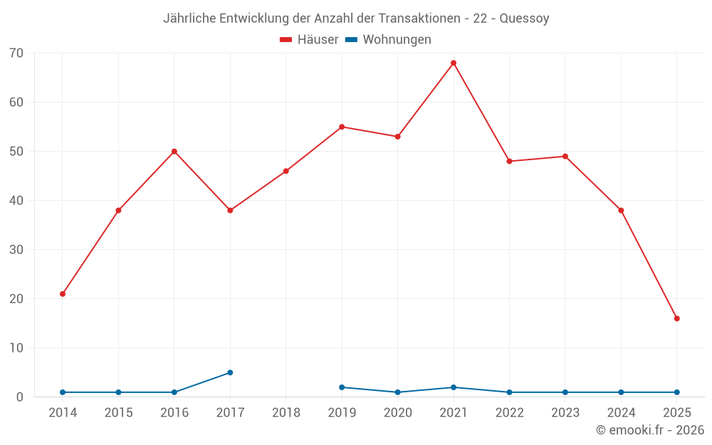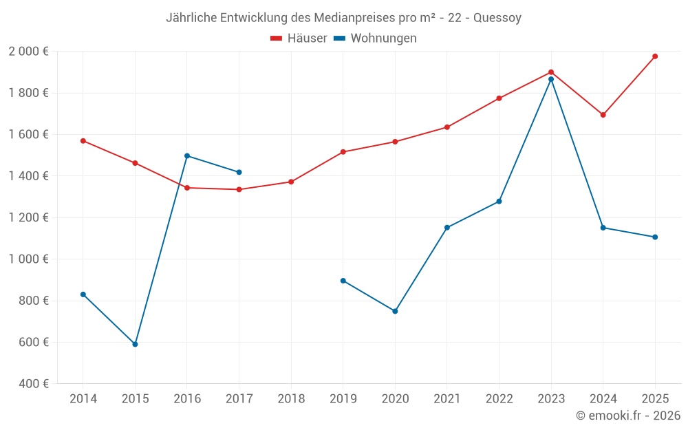 Der Durchschnittspreis auf den 37 Hausgeschäften der letzten 12 Monate in der Gemeinde Quessoy betrug 1 952 € pro Quadratmeter für einen mittleren Immobilienwert von 176 000 €. Über diesen Zeitraum hinweg lagen 60% der Transaktionen zwischen 1 335 und 2 341 € pro Quadratmeter (vom 2. bis zum 8. Dezil).