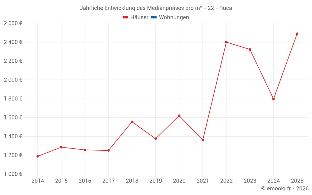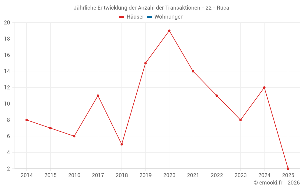 Der Durchschnittspreis auf den 19 Hausgeschäften der letzten 24 Monate in der Gemeinde Ruca betrug 2 064 € pro Quadratmeter für einen mittleren Immobilienwert von 227 000 €. Über diesen Zeitraum hinweg lagen 60% der Transaktionen zwischen 1 655 und 2 351 € pro Quadratmeter (vom 2. bis zum 8. Dezil).