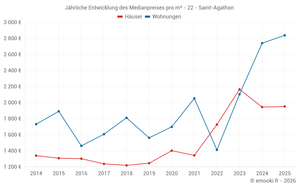 Der Durchschnittspreis auf den 20 Hausgeschäften der letzten 12 Monate in der Gemeinde Saint-Agathon betrug 2 040 € pro Quadratmeter für einen mittleren Immobilienwert von 179 000 €. Über diesen Zeitraum hinweg lagen 60% der Transaktionen zwischen 1 345 und 2 375 € pro Quadratmeter (vom 2. bis zum 8. Dezil).