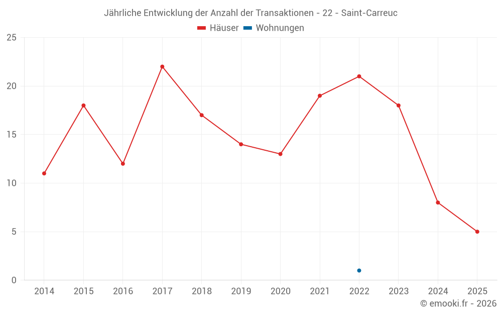 Der Durchschnittspreis auf den 18 Hausgeschäften der letzten 24 Monate in der Gemeinde Saint-Carreuc betrug 1 532 € pro Quadratmeter für einen mittleren Immobilienwert von 150 950 €. Über diesen Zeitraum hinweg lagen 60% der Transaktionen zwischen 1 107 und 2 266 € pro Quadratmeter (vom 2. bis zum 8. Dezil).