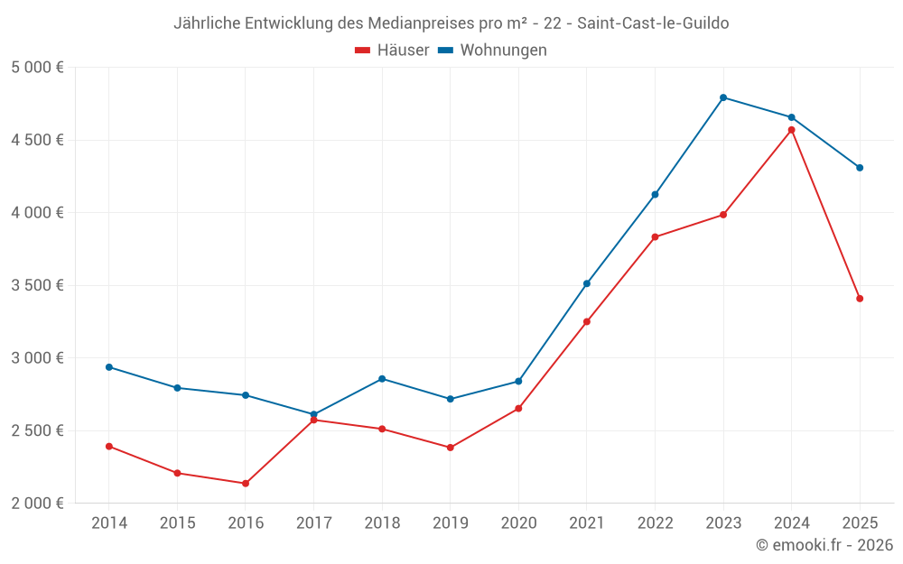 Der Durchschnittspreis auf den 18 Wohnungstransaktionen der letzten 6 Monate in der Gemeinde Saint-Cast-le-Guildo betrug 4 309 € pro Quadratmeter für einen mittleren Immobilienwert von 174 250 €. Über diesen Zeitraum hinweg lagen 60% der Transaktionen zwischen 3 159 und 5 767 € pro Quadratmeter (vom 2. bis zum 8. Dezil).