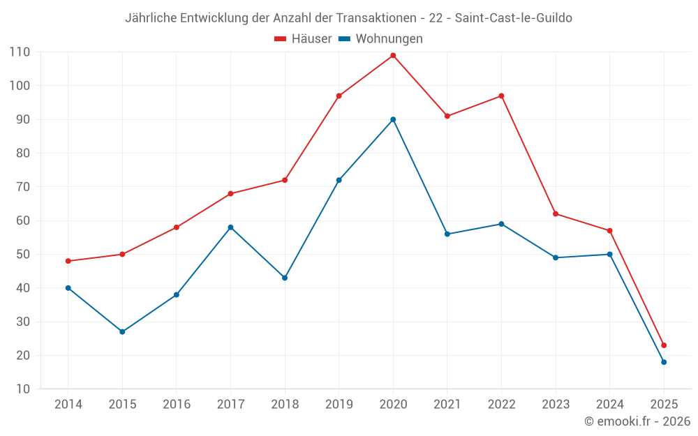 Der Durchschnittspreis auf den 23 Hausgeschäften der letzten 6 Monate in der Gemeinde Saint-Cast-le-Guildo betrug 3 409 € pro Quadratmeter für einen mittleren Immobilienwert von 270 000 €. Über diesen Zeitraum hinweg lagen 60% der Transaktionen zwischen 2 503 und 4 522 € pro Quadratmeter (vom 2. bis zum 8. Dezil).