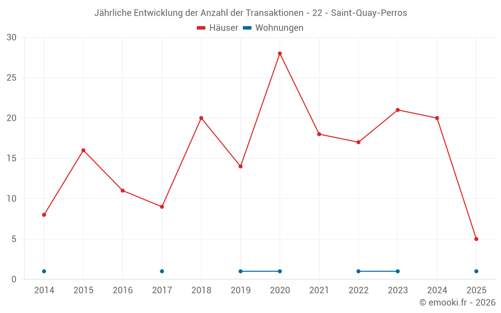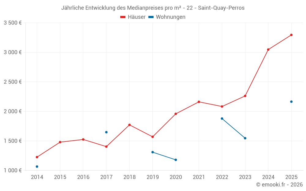 Der Durchschnittspreis auf den 18 Hausgeschäften der letzten 12 Monate in der Gemeinde Saint-Quay-Perros betrug 3 183 € pro Quadratmeter für einen mittleren Immobilienwert von 305 500 €. Über diesen Zeitraum hinweg lagen 60% der Transaktionen zwischen 2 408 und 3 411 € pro Quadratmeter (vom 2. bis zum 8. Dezil).
