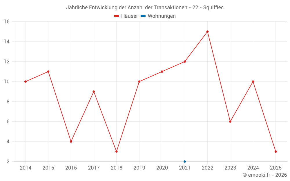 Der Durchschnittspreis auf den 17 Hausgeschäften der letzten 24 Monate in der Gemeinde Squiffiec betrug 1 573 € pro Quadratmeter für einen mittleren Immobilienwert von 178 365 €. Über diesen Zeitraum hinweg lagen 60% der Transaktionen zwischen 1 181 und 1 866 € pro Quadratmeter (vom 2. bis zum 8. Dezil).