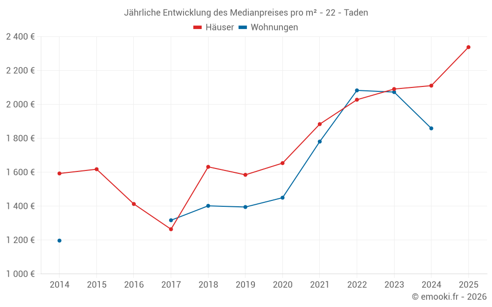 Der Durchschnittspreis auf den 26 Hausgeschäften der letzten 12 Monate in der Gemeinde Taden betrug 2 246 € pro Quadratmeter für einen mittleren Immobilienwert von 214 525 €. Über diesen Zeitraum hinweg lagen 60% der Transaktionen zwischen 1 829 und 2 649 € pro Quadratmeter (vom 2. bis zum 8. Dezil).