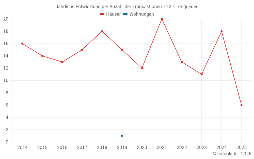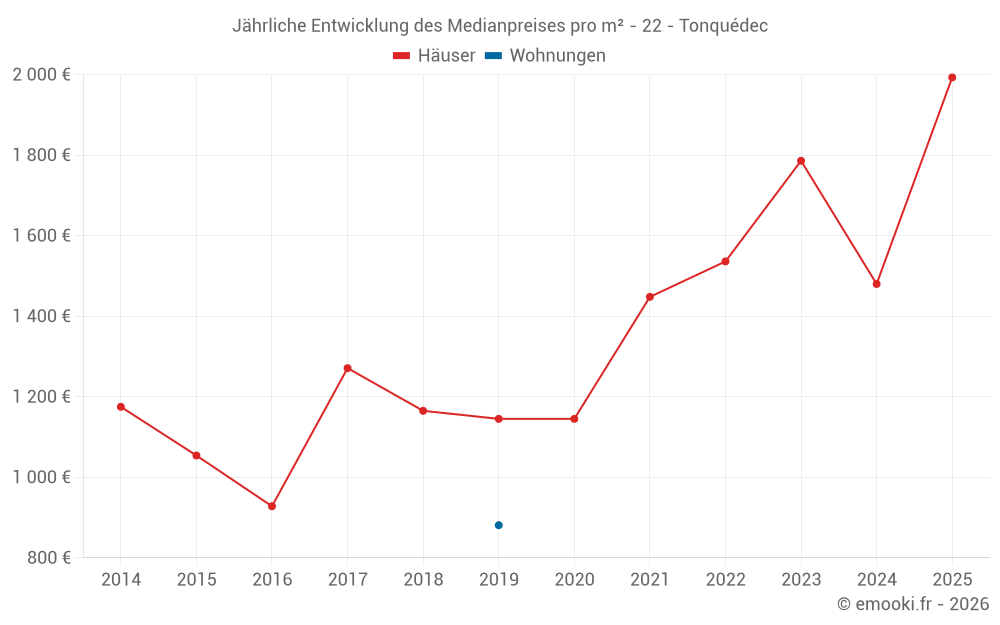 Der Durchschnittspreis auf den 17 Hausgeschäften der letzten 12 Monate in der Gemeinde Tonquédec betrug 1 978 € pro Quadratmeter für einen mittleren Immobilienwert von 160 000 €. Über diesen Zeitraum hinweg lagen 60% der Transaktionen zwischen 1 208 und 2 297 € pro Quadratmeter (vom 2. bis zum 8. Dezil).