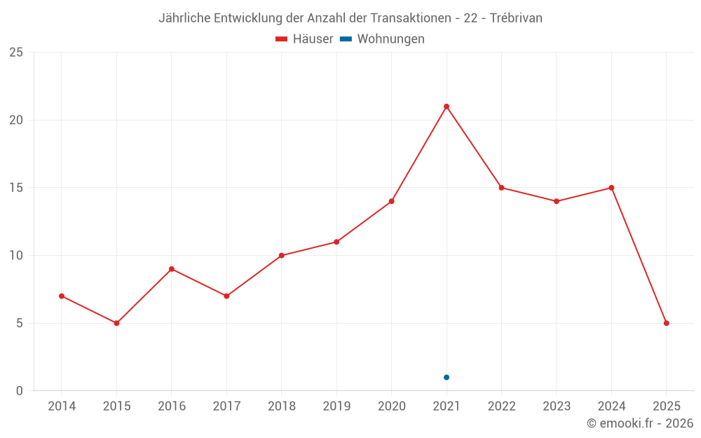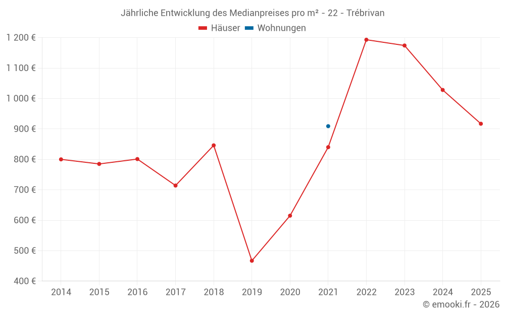 Der Durchschnittspreis auf den 27 Hausgeschäften der letzten 24 Monate in der Gemeinde Trébrivan betrug 1 028 € pro Quadratmeter für einen mittleren Immobilienwert von 95 400 €. Über diesen Zeitraum hinweg lagen 60% der Transaktionen zwischen 737 und 1 476 € pro Quadratmeter (vom 2. bis zum 8. Dezil).