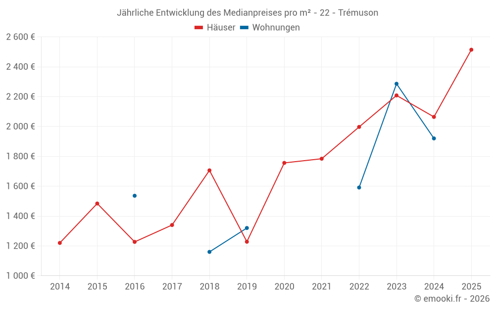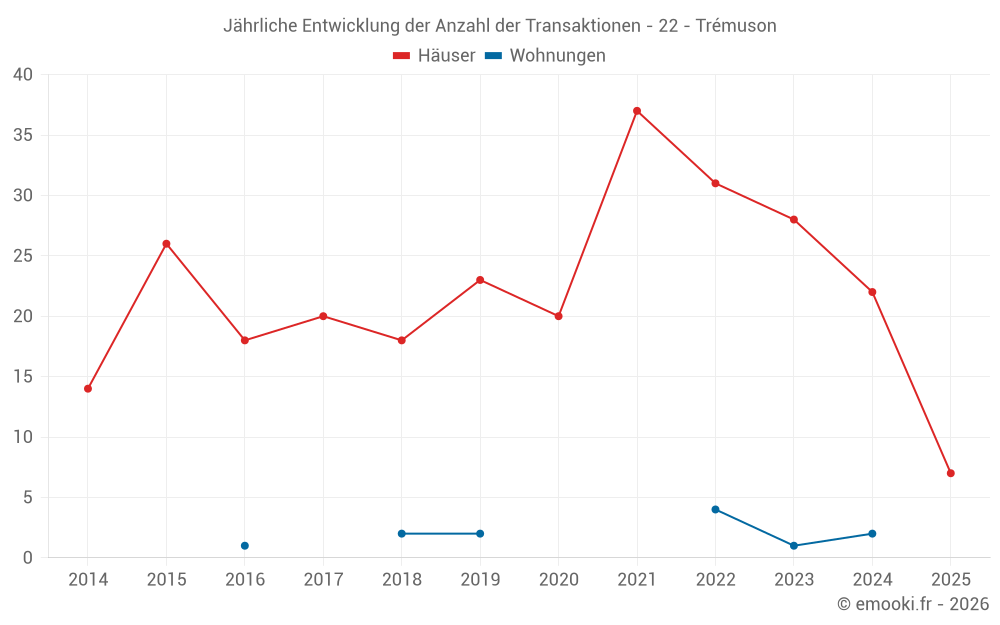 Der Durchschnittspreis auf den 19 Hausgeschäften der letzten 12 Monate in der Gemeinde Trémuson betrug 2 359 € pro Quadratmeter für einen mittleren Immobilienwert von 212 850 €. Über diesen Zeitraum hinweg lagen 60% der Transaktionen zwischen 1 928 und 2 858 € pro Quadratmeter (vom 2. bis zum 8. Dezil).