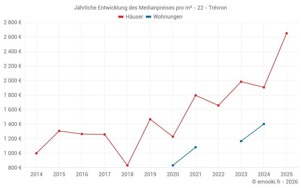 Der Durchschnittspreis auf den 19 Hausgeschäften der letzten 24 Monate in der Gemeinde Trévron betrug 2 143 € pro Quadratmeter für einen mittleren Immobilienwert von 175 000 €. Über diesen Zeitraum hinweg lagen 60% der Transaktionen zwischen 1 494 und 2 744 € pro Quadratmeter (vom 2. bis zum 8. Dezil).