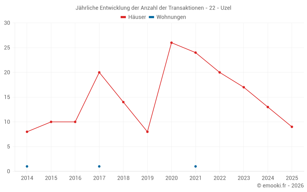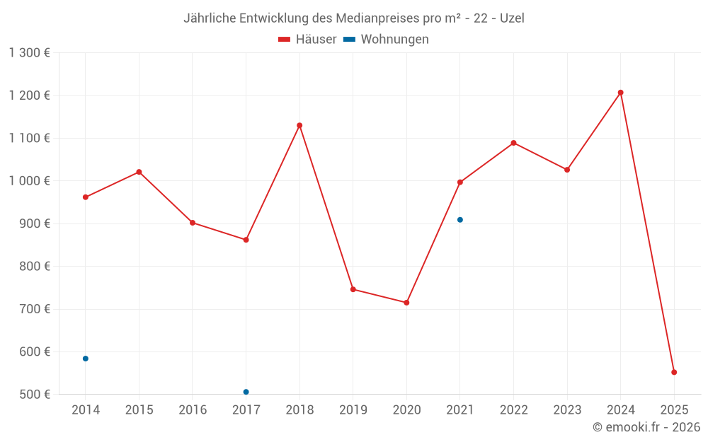 Der Durchschnittspreis auf den 16 Hausgeschäften der letzten 12 Monate in der Gemeinde Uzel betrug 704 € pro Quadratmeter für einen mittleren Immobilienwert von 84 000 €. Über diesen Zeitraum hinweg lagen 60% der Transaktionen zwischen 294 und 1 504 € pro Quadratmeter (vom 2. bis zum 8. Dezil).