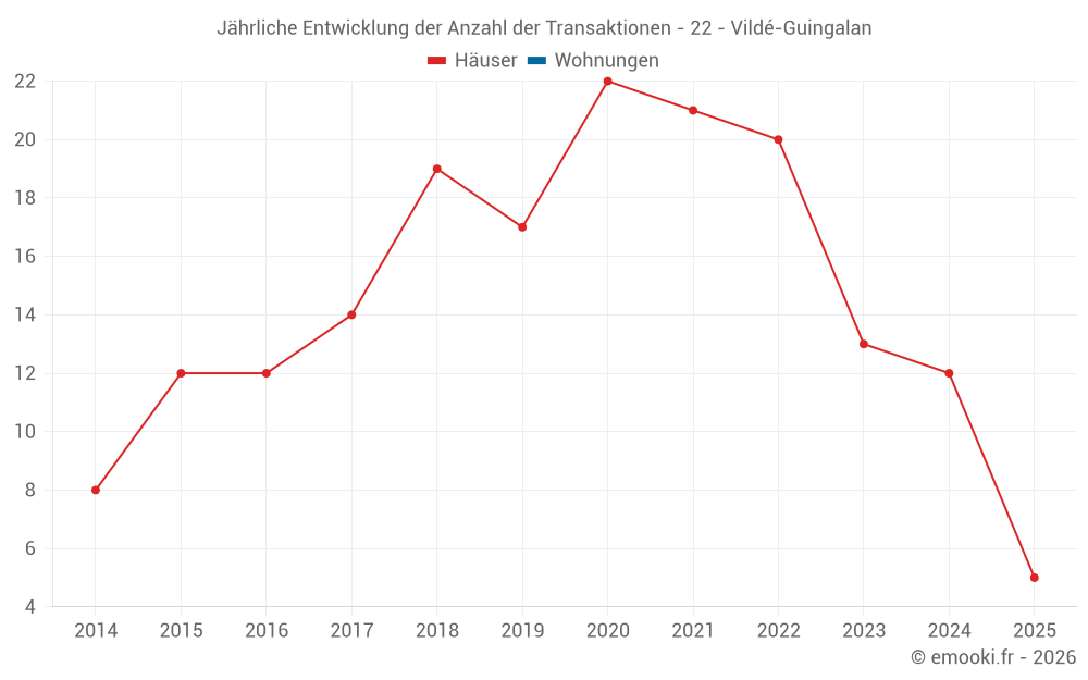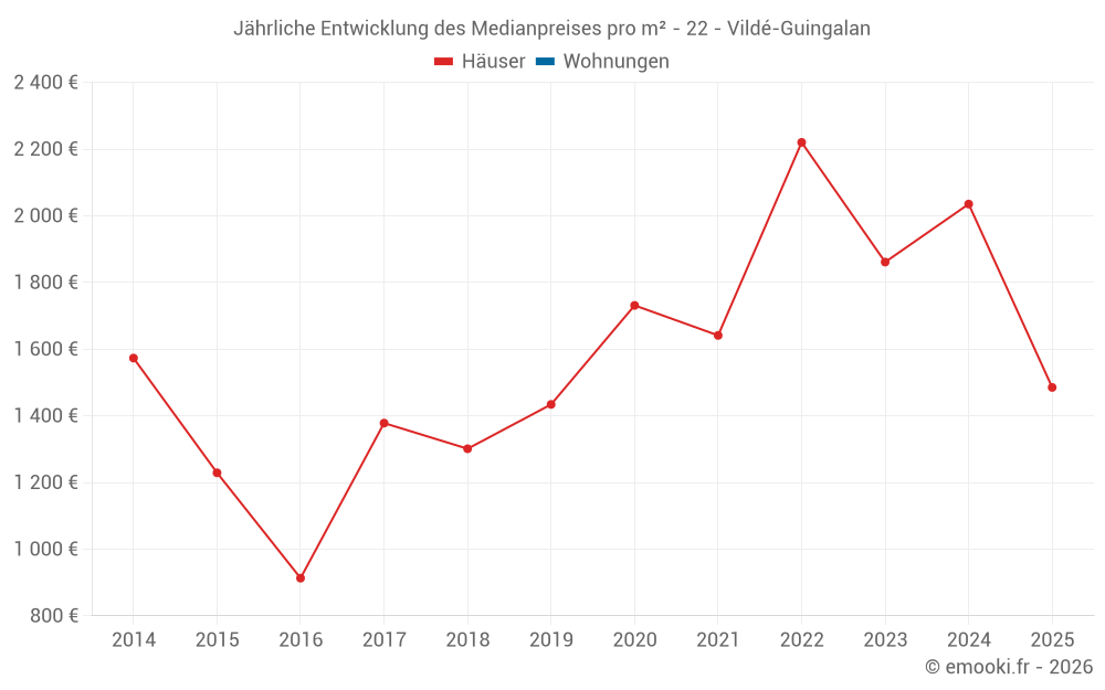 Der Durchschnittspreis auf den 24 Hausgeschäften der letzten 24 Monate in der Gemeinde Vildé-Guingalan betrug 1 644 € pro Quadratmeter für einen mittleren Immobilienwert von 190 500 €. Über diesen Zeitraum hinweg lagen 60% der Transaktionen zwischen 1 324 und 2 353 € pro Quadratmeter (vom 2. bis zum 8. Dezil).