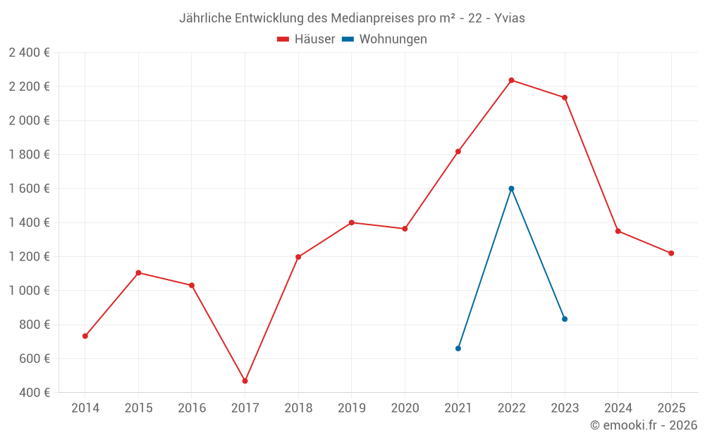 Der Durchschnittspreis auf den 19 Hausgeschäften der letzten 24 Monate in der Gemeinde Yvias betrug 1 413 € pro Quadratmeter für einen mittleren Immobilienwert von 150 000 €. Über diesen Zeitraum hinweg lagen 60% der Transaktionen zwischen 1 235 und 2 252 € pro Quadratmeter (vom 2. bis zum 8. Dezil).