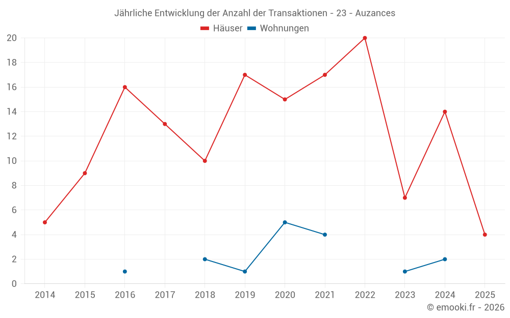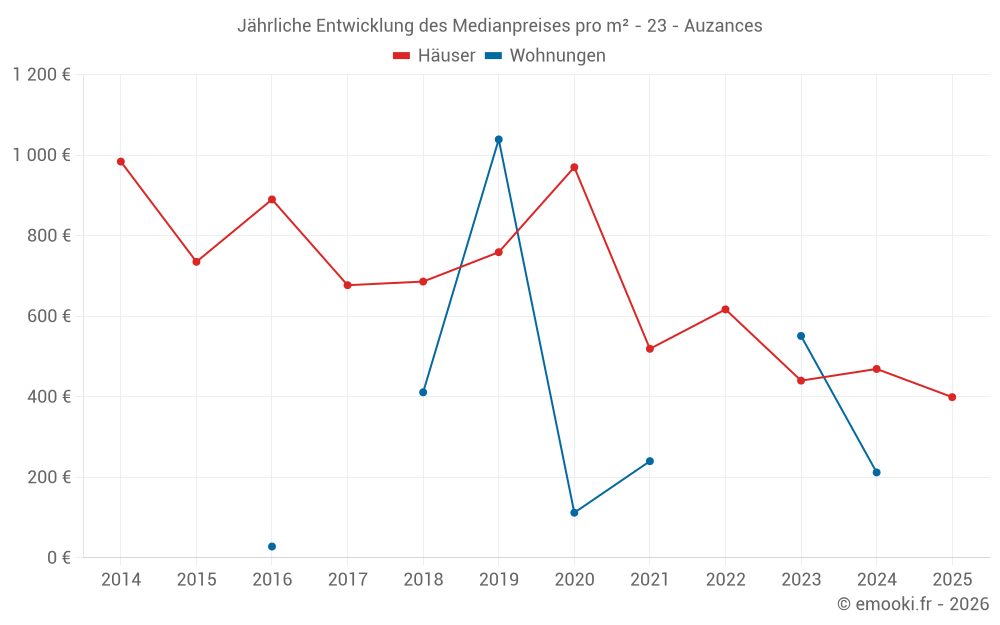 Der Durchschnittspreis auf den 21 Hausgeschäften der letzten 24 Monate in der Gemeinde Auzances betrug 500 € pro Quadratmeter für einen mittleren Immobilienwert von 55 000 €. Über diesen Zeitraum hinweg lagen 60% der Transaktionen zwischen 327 und 973 € pro Quadratmeter (vom 2. bis zum 8. Dezil).