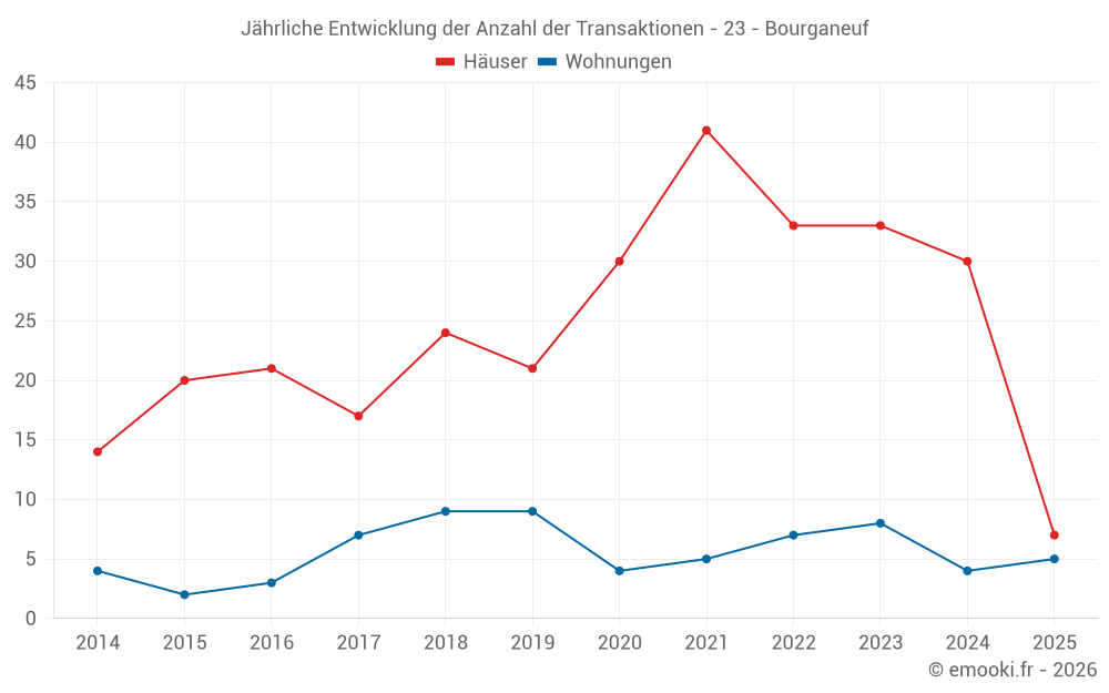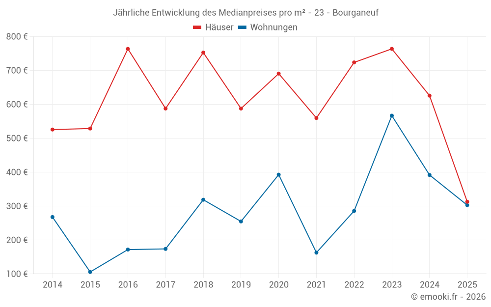 Der Durchschnittspreis auf den 22 Hausgeschäften der letzten 12 Monate in der Gemeinde Bourganeuf betrug 625 € pro Quadratmeter für einen mittleren Immobilienwert von 48 500 €. Über diesen Zeitraum hinweg lagen 60% der Transaktionen zwischen 278 und 995 € pro Quadratmeter (vom 2. bis zum 8. Dezil).