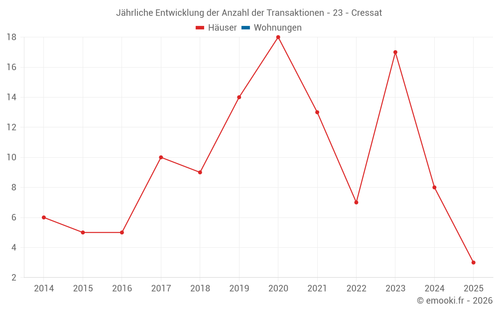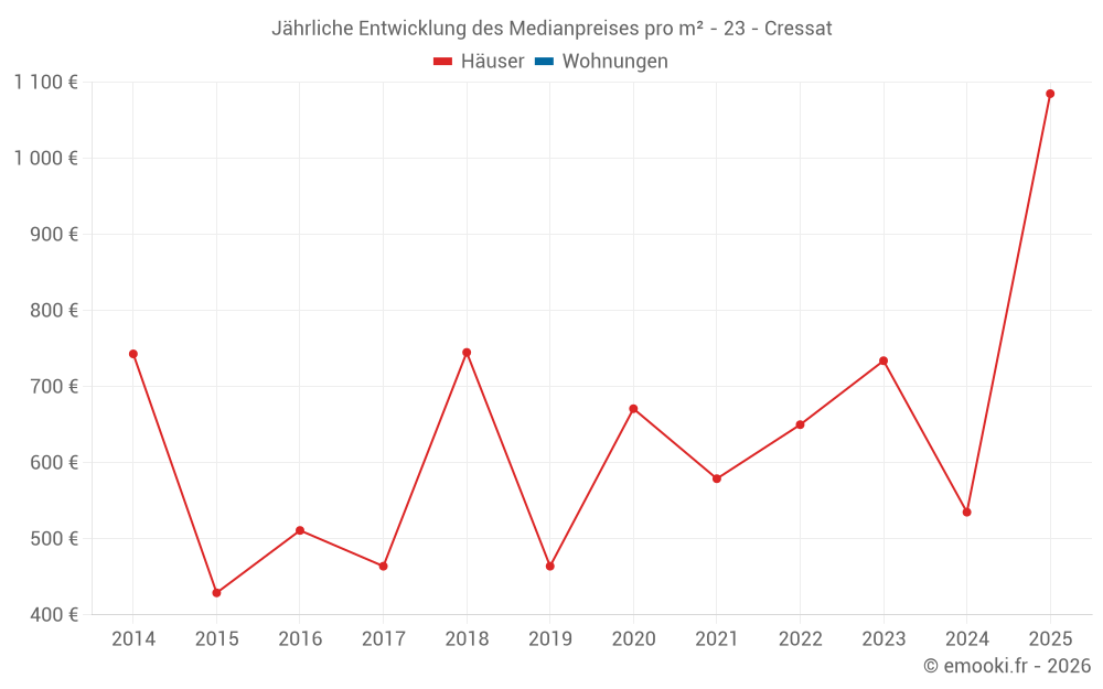 Der Durchschnittspreis auf den 19 Hausgeschäften der letzten 24 Monate in der Gemeinde Cressat betrug 723 € pro Quadratmeter für einen mittleren Immobilienwert von 72 000 €. Über diesen Zeitraum hinweg lagen 60% der Transaktionen zwischen 295 und 1 058 € pro Quadratmeter (vom 2. bis zum 8. Dezil).