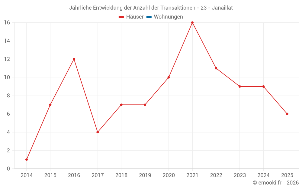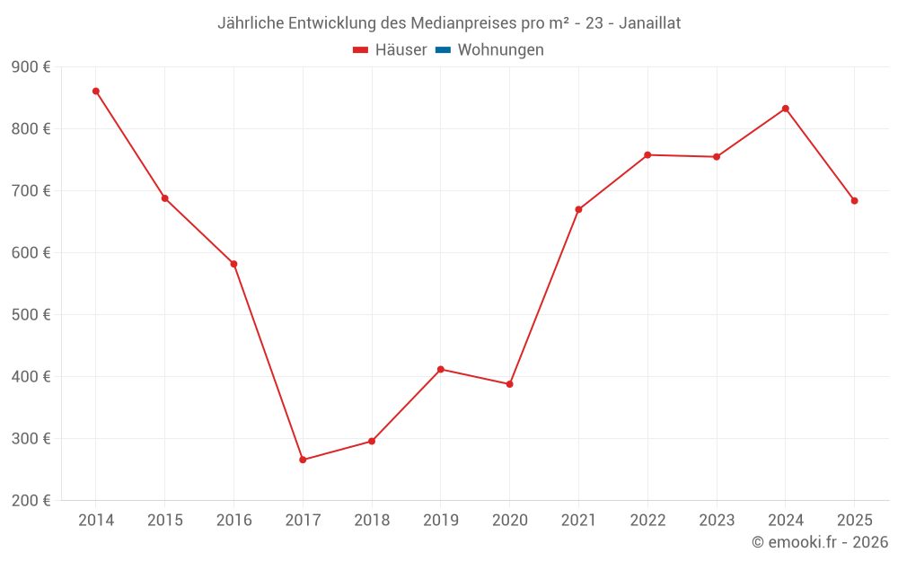Der Durchschnittspreis auf den 20 Hausgeschäften der letzten 24 Monate in der Gemeinde Janaillat betrug 733 € pro Quadratmeter für einen mittleren Immobilienwert von 78 750 €. Über diesen Zeitraum hinweg lagen 60% der Transaktionen zwischen 487 und 1 276 € pro Quadratmeter (vom 2. bis zum 8. Dezil).