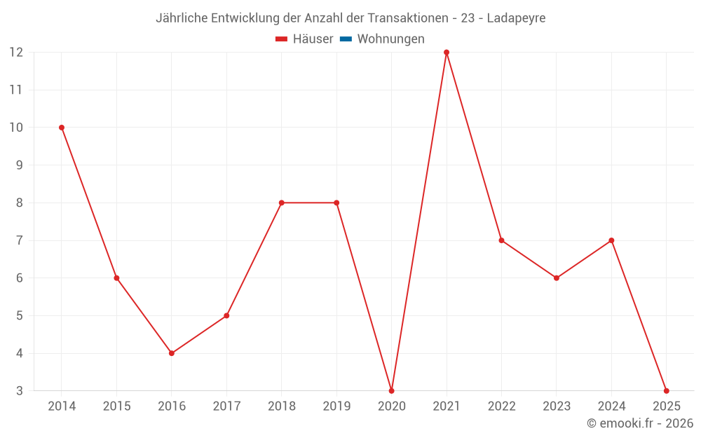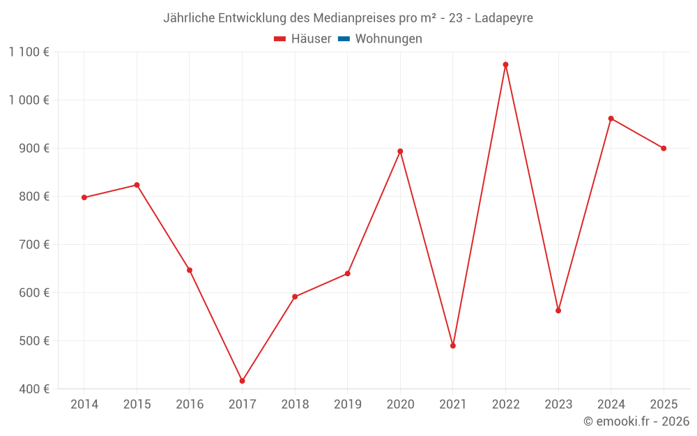 Der Durchschnittspreis auf den 14 Hausgeschäften der letzten 24 Monate in der Gemeinde Ladapeyre betrug 843 € pro Quadratmeter für einen mittleren Immobilienwert von 50 364 €. Über diesen Zeitraum hinweg lagen 60% der Transaktionen zwischen 566 und 1 376 € pro Quadratmeter (vom 2. bis zum 8. Dezil).