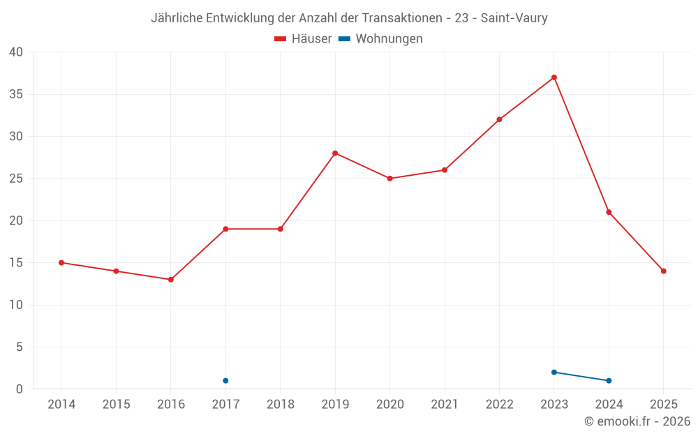 Der Durchschnittspreis auf den 25 Hausgeschäften der letzten 12 Monate in der Gemeinde Saint-Vaury betrug 700 € pro Quadratmeter für einen mittleren Immobilienwert von 70 000 €. Über diesen Zeitraum hinweg lagen 60% der Transaktionen zwischen 467 und 1 109 € pro Quadratmeter (vom 2. bis zum 8. Dezil).