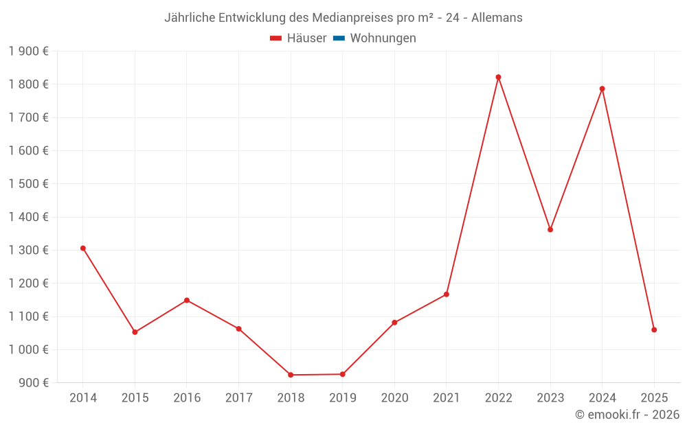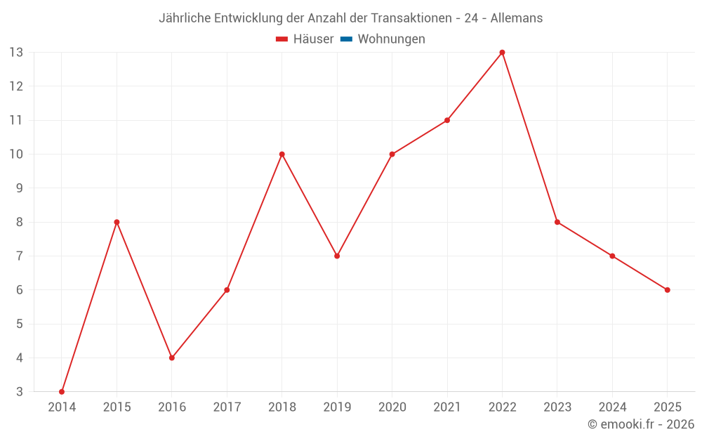 Der Durchschnittspreis auf den 16 Hausgeschäften der letzten 24 Monate in der Gemeinde Allemans betrug 1 400 € pro Quadratmeter für einen mittleren Immobilienwert von 157 000 €. Über diesen Zeitraum hinweg lagen 60% der Transaktionen zwischen 826 und 1 931 € pro Quadratmeter (vom 2. bis zum 8. Dezil).