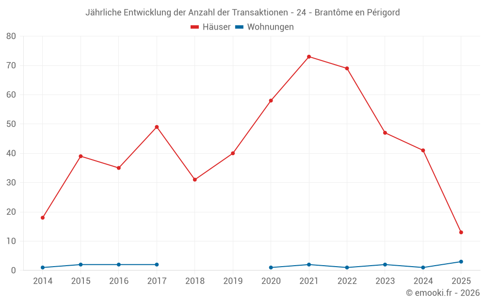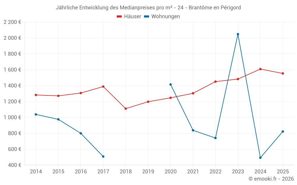 Der Durchschnittspreis auf den 36 Hausgeschäften der letzten 12 Monate in der Gemeinde Brantôme en Périgord betrug 1 572 € pro Quadratmeter für einen mittleren Immobilienwert von 151 260 €. Über diesen Zeitraum hinweg lagen 60% der Transaktionen zwischen 1 081 und 1 923 € pro Quadratmeter (vom 2. bis zum 8. Dezil).