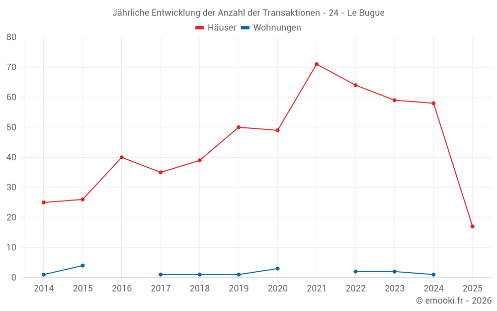 Der Durchschnittspreis auf den 52 Hausgeschäften der letzten 12 Monate in der Gemeinde Le Bugue betrug 1 708 € pro Quadratmeter für einen mittleren Immobilienwert von 144 750 €. Über diesen Zeitraum hinweg lagen 60% der Transaktionen zwischen 1 009 und 2 465 € pro Quadratmeter (vom 2. bis zum 8. Dezil).