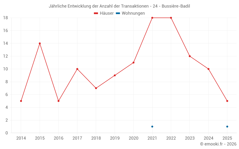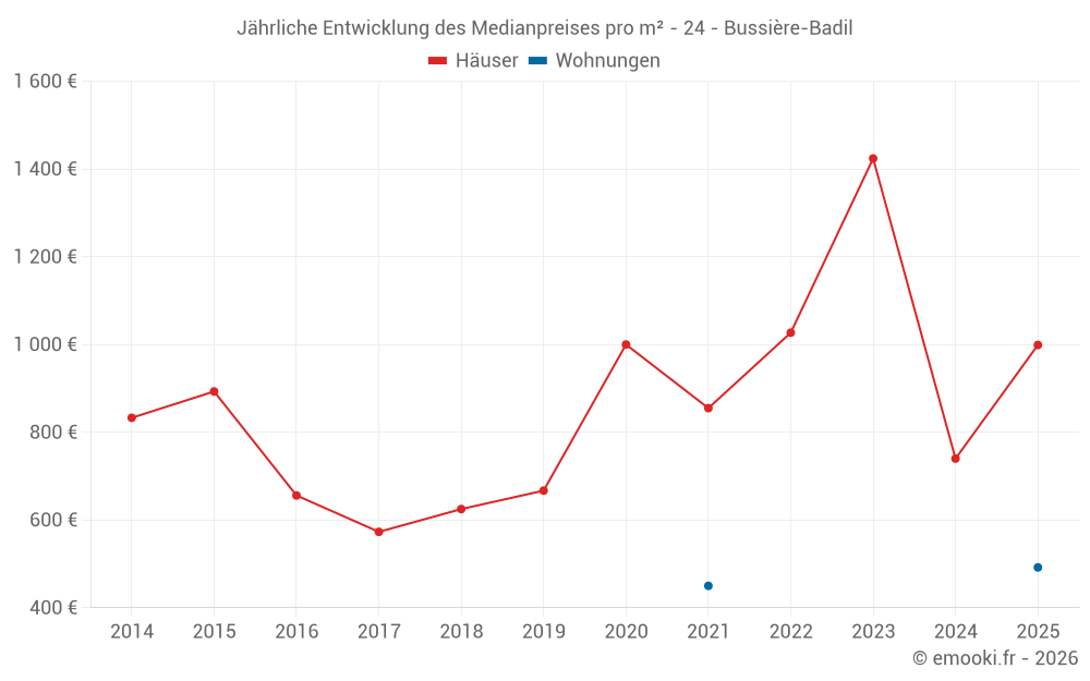 Der Durchschnittspreis auf den 15 Hausgeschäften der letzten 24 Monate in der Gemeinde Bussière-Badil betrug 951 € pro Quadratmeter für einen mittleren Immobilienwert von 111 925 €. Über diesen Zeitraum hinweg lagen 60% der Transaktionen zwischen 537 und 2 050 € pro Quadratmeter (vom 2. bis zum 8. Dezil).