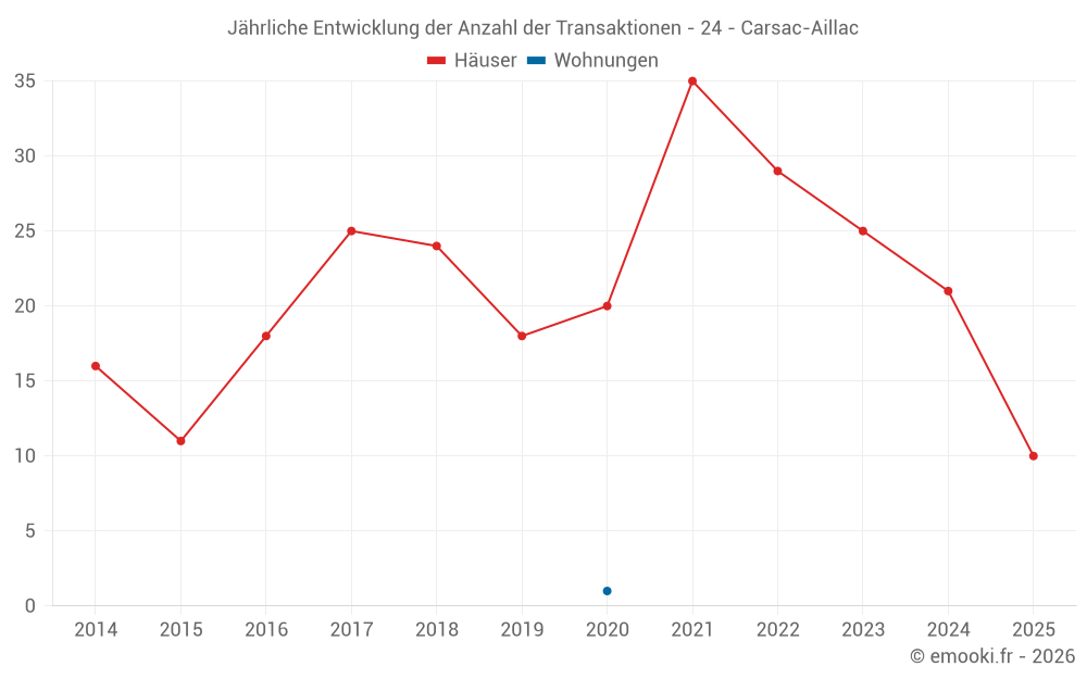 Der Durchschnittspreis auf den 27 Hausgeschäften der letzten 12 Monate in der Gemeinde Carsac-Aillac betrug 2 736 € pro Quadratmeter für einen mittleren Immobilienwert von 220 000 €. Über diesen Zeitraum hinweg lagen 60% der Transaktionen zwischen 1 615 und 3 229 € pro Quadratmeter (vom 2. bis zum 8. Dezil).