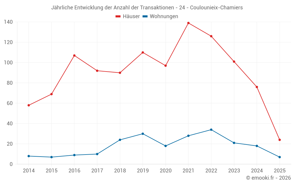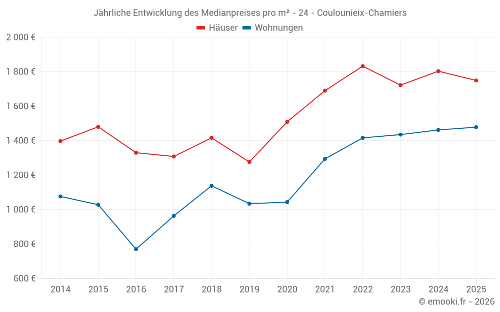 Der Durchschnittspreis auf den 24 Hausgeschäften der letzten 6 Monate in der Gemeinde Coulounieix-Chamiers betrug 1 749 € pro Quadratmeter für einen mittleren Immobilienwert von 150 000 €. Über diesen Zeitraum hinweg lagen 60% der Transaktionen zwischen 1 519 und 2 159 € pro Quadratmeter (vom 2. bis zum 8. Dezil).