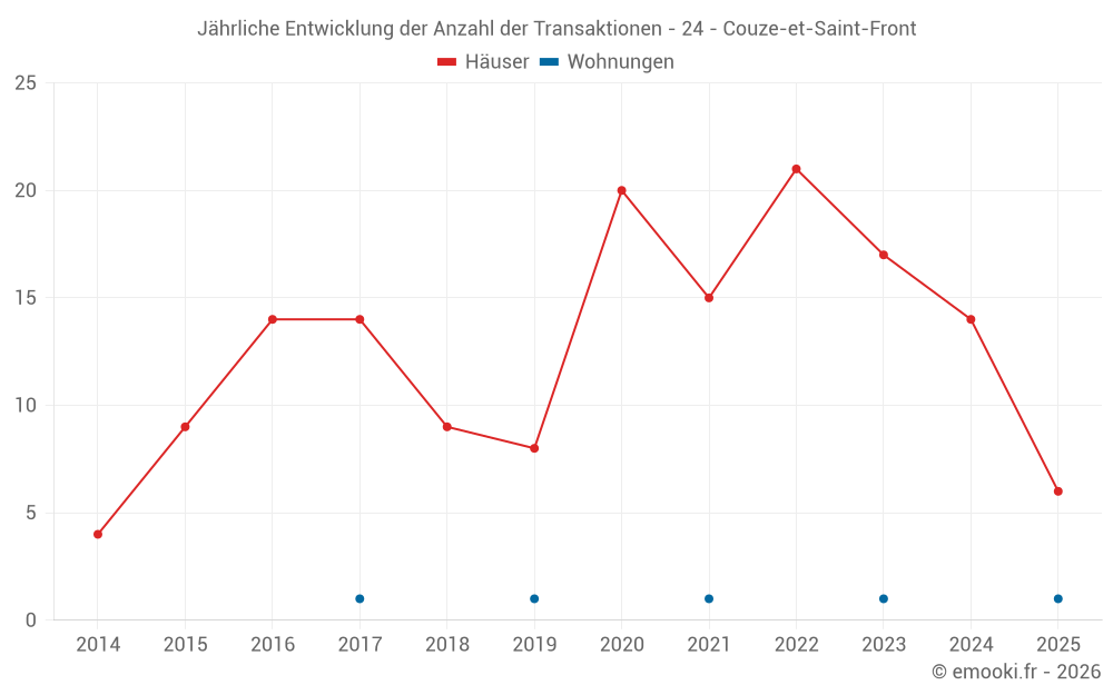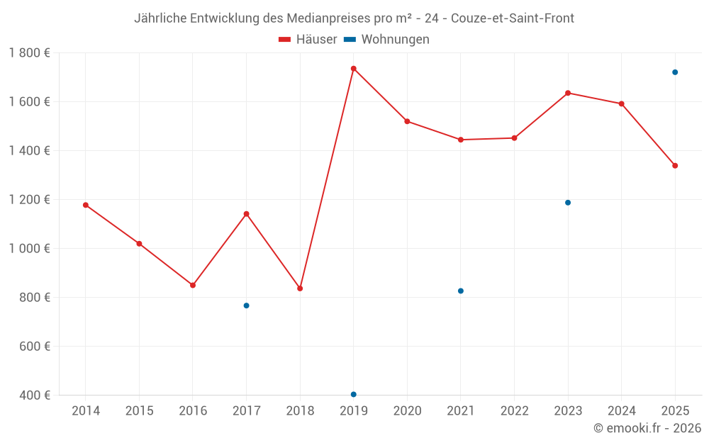 Der Durchschnittspreis auf den 16 Hausgeschäften der letzten 12 Monate in der Gemeinde Couze-et-Saint-Front betrug 1 359 € pro Quadratmeter für einen mittleren Immobilienwert von 114 000 €. Über diesen Zeitraum hinweg lagen 60% der Transaktionen zwischen 1 100 und 2 016 € pro Quadratmeter (vom 2. bis zum 8. Dezil).