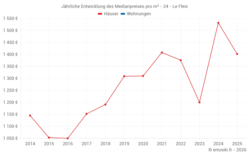 Der Durchschnittspreis auf den 31 Hausgeschäften der letzten 24 Monate in der Gemeinde Le Fleix betrug 1 308 € pro Quadratmeter für einen mittleren Immobilienwert von 140 000 €. Über diesen Zeitraum hinweg lagen 60% der Transaktionen zwischen 753 und 1 880 € pro Quadratmeter (vom 2. bis zum 8. Dezil).