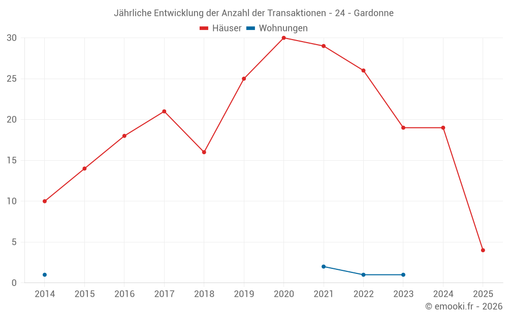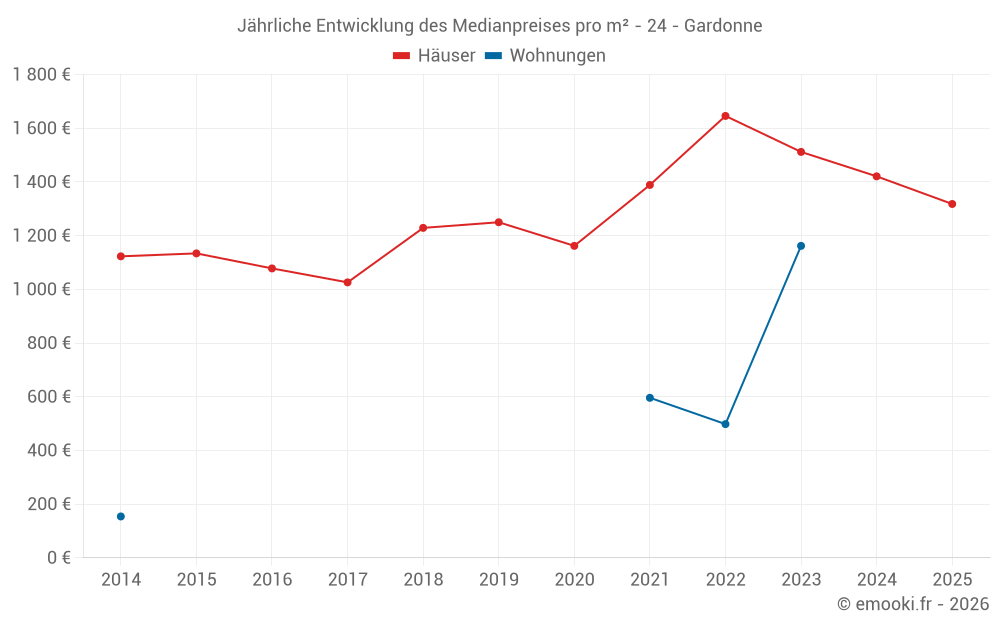 Der Durchschnittspreis auf den 32 Hausgeschäften der letzten 24 Monate in der Gemeinde Gardonne betrug 1 466 € pro Quadratmeter für einen mittleren Immobilienwert von 144 500 €. Über diesen Zeitraum hinweg lagen 60% der Transaktionen zwischen 1 000 und 1 862 € pro Quadratmeter (vom 2. bis zum 8. Dezil).