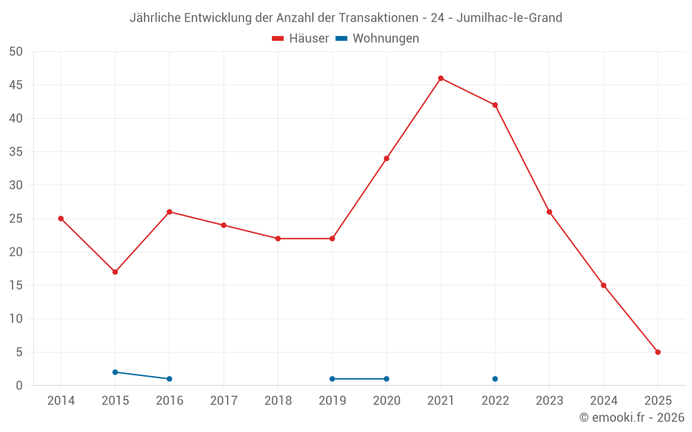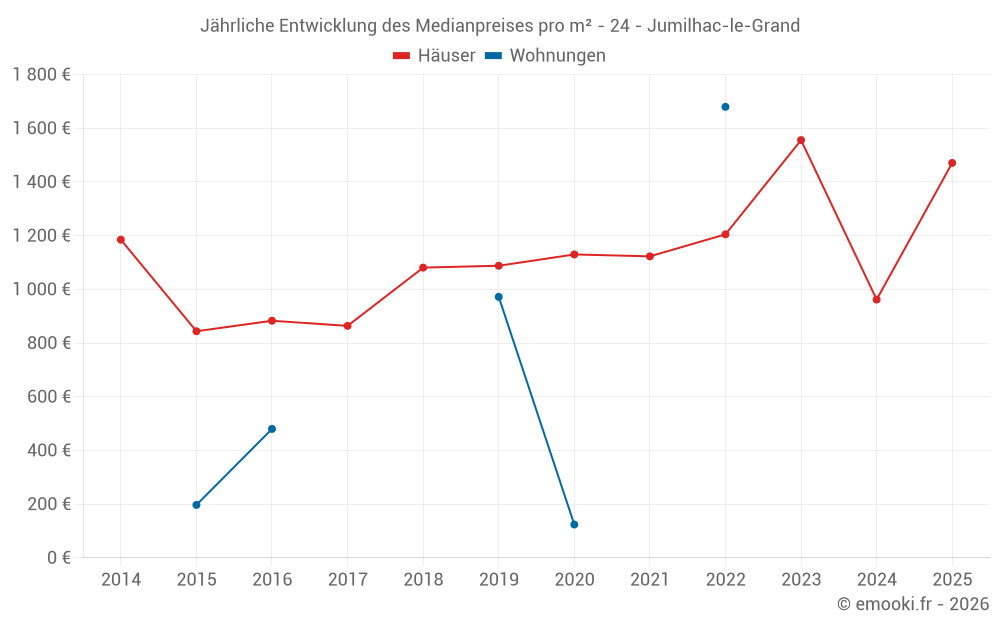 Der Durchschnittspreis auf den 31 Hausgeschäften der letzten 24 Monate in der Gemeinde Jumilhac-le-Grand betrug 1 296 € pro Quadratmeter für einen mittleren Immobilienwert von 130 000 €. Über diesen Zeitraum hinweg lagen 60% der Transaktionen zwischen 758 und 2 136 € pro Quadratmeter (vom 2. bis zum 8. Dezil).