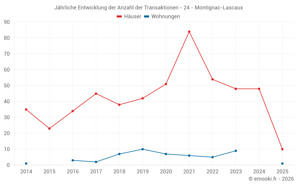 Der Durchschnittspreis auf den 36 Hausgeschäften der letzten 12 Monate in der Gemeinde Montignac-Lascaux betrug 1 538 € pro Quadratmeter für einen mittleren Immobilienwert von 150 000 €. Über diesen Zeitraum hinweg lagen 60% der Transaktionen zwischen 923 und 2 283 € pro Quadratmeter (vom 2. bis zum 8. Dezil).