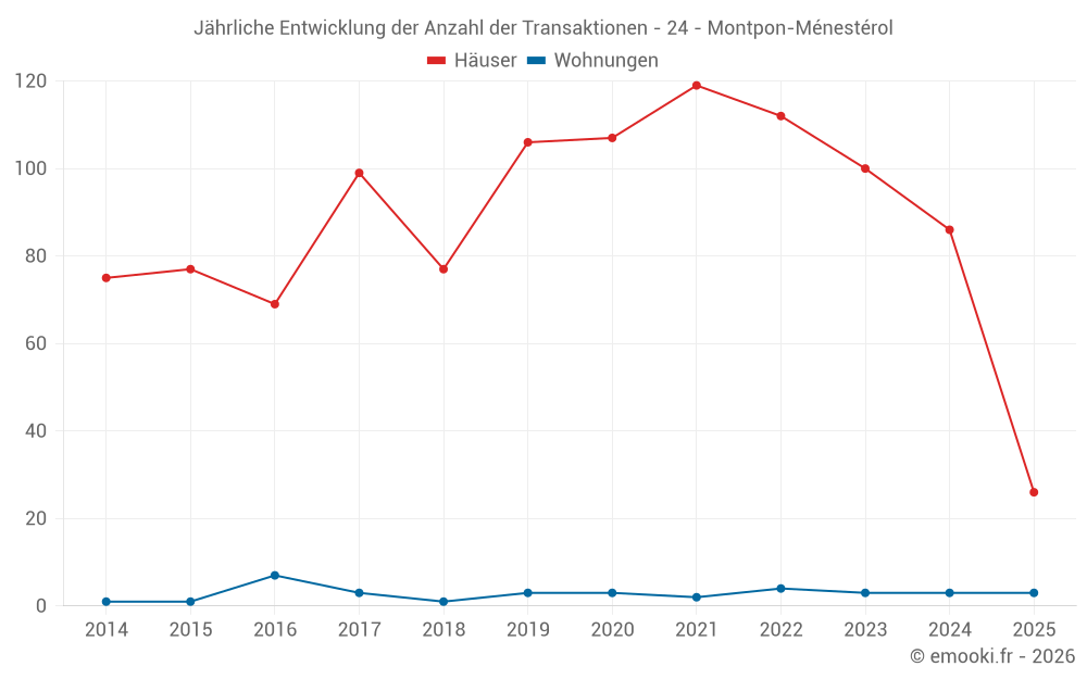 Der Durchschnittspreis auf den 26 Hausgeschäften der letzten 6 Monate in der Gemeinde Montpon-Ménestérol betrug 1 445 € pro Quadratmeter für einen mittleren Immobilienwert von 115 750 €. Über diesen Zeitraum hinweg lagen 60% der Transaktionen zwischen 1 074 und 1 739 € pro Quadratmeter (vom 2. bis zum 8. Dezil).