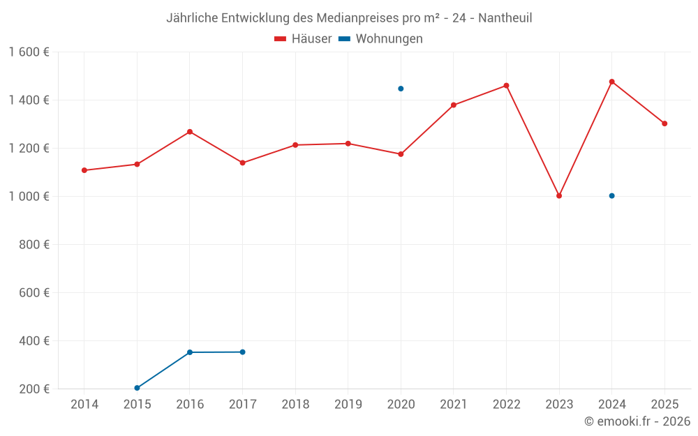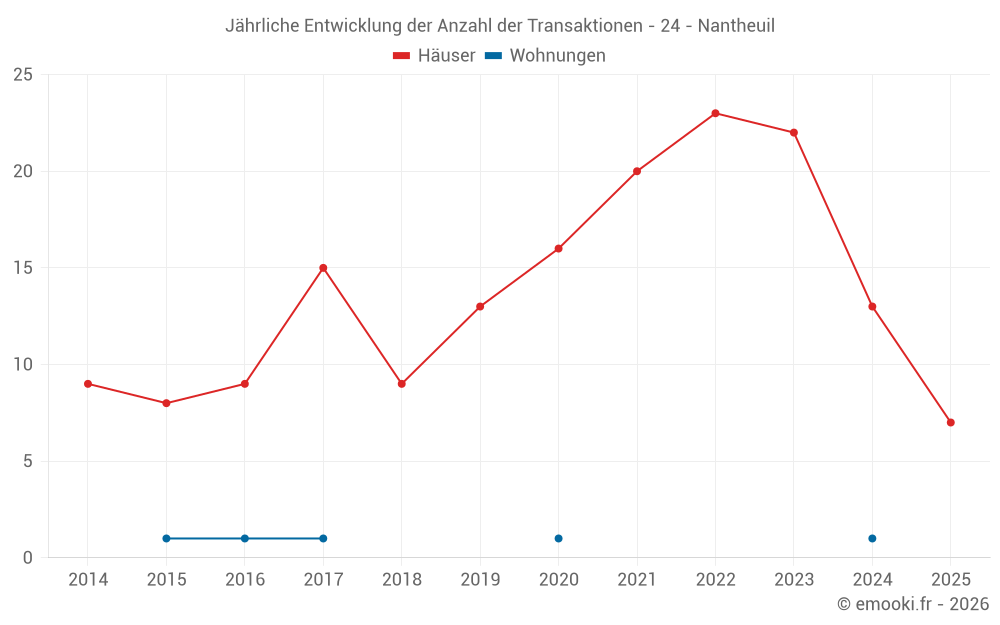 Der Durchschnittspreis auf den 16 Hausgeschäften der letzten 12 Monate in der Gemeinde Nantheuil betrug 1 431 € pro Quadratmeter für einen mittleren Immobilienwert von 125 000 €. Über diesen Zeitraum hinweg lagen 60% der Transaktionen zwischen 717 und 1 758 € pro Quadratmeter (vom 2. bis zum 8. Dezil).