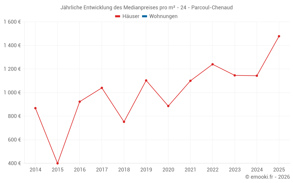 Der Durchschnittspreis auf den 27 Hausgeschäften der letzten 24 Monate in der Gemeinde Parcoul-Chenaud betrug 1 271 € pro Quadratmeter für einen mittleren Immobilienwert von 133 000 €. Über diesen Zeitraum hinweg lagen 60% der Transaktionen zwischen 759 und 1 547 € pro Quadratmeter (vom 2. bis zum 8. Dezil).